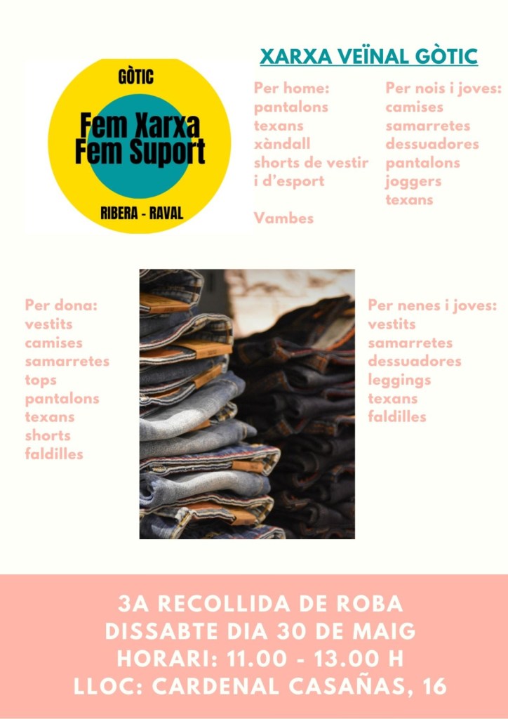 Fem Xarxa Fem Suport (recollida de roba) 27 de Mai de 2020 Més info: AQUÍ Comparteix això: Comparteix al Facebook (S'obre en una nova finestra) Facebook Share on WhatsApp (S'obre en una nova finestra) WhatsApp Share on Telegram (S'obre en una nova finestra) Telegram Email a link to a friend (S'obre en una nova finestra) Correu electrònic Share on X (S'obre en una nova finestra) X M'agrada S'està carregant... Related