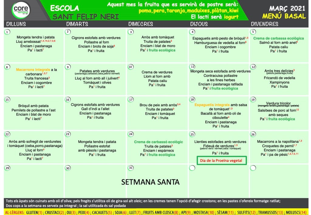 Menú Març 2021 26 de febrer de 2021 Hola, us adjuntem el menú basal. Si voleu altres menús podeu clickar en aquest LINK Comparteix això: Comparteix al Facebook (S'obre en una nova finestra) Facebook Share on WhatsApp (S'obre en una nova finestra) WhatsApp Share on Telegram (S'obre en una nova finestra) Telegram Email a link to a friend (S'obre en una nova finestra) Correu electrònic Share on X (S'obre en una nova finestra) X M'agrada S'està carregant... Related