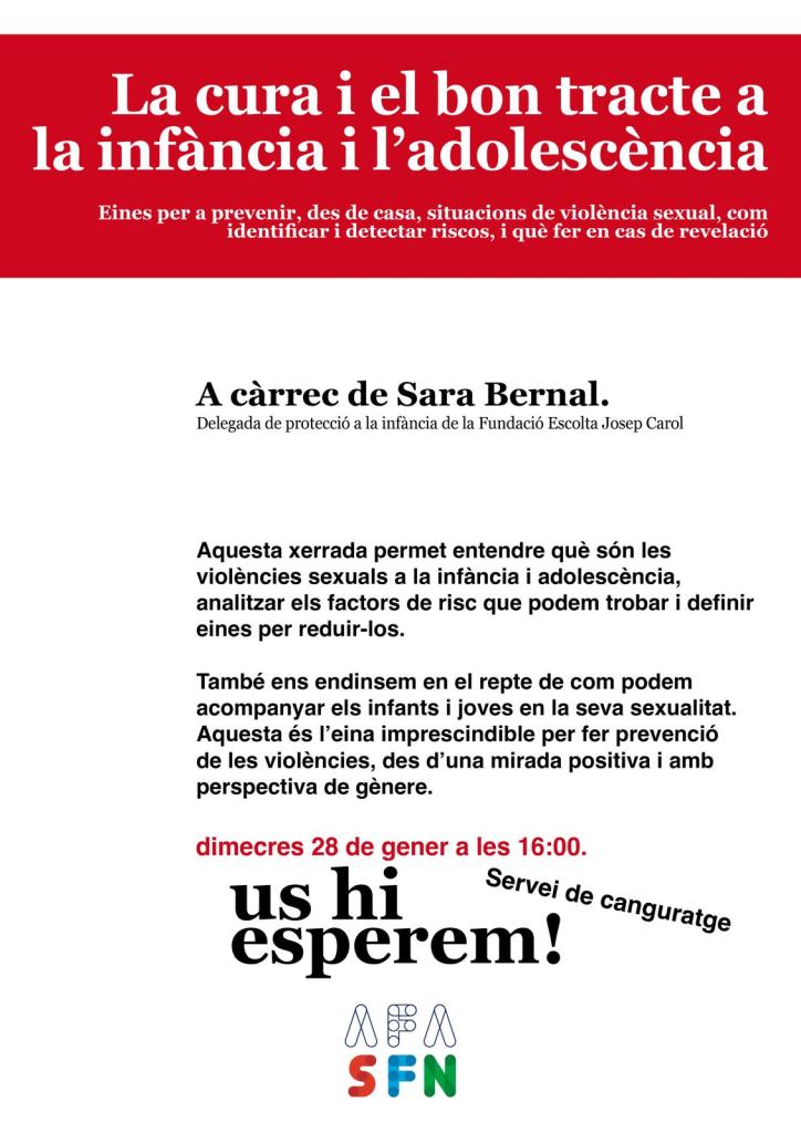 Xerrada: “La cura i el bon tracte a la infància i adolescència” 19 de gener de 2026 Comparteix això: Comparteix al Facebook (S'obre en una nova finestra) Facebook Share on WhatsApp (S'obre en una nova finestra) WhatsApp Share on Telegram (S'obre en una nova finestra) Telegram Email a link to a friend (S'obre en una nova finestra) Correu electrònic Share on X (S'obre en una nova finestra) X M'agrada S'està carregant... Related