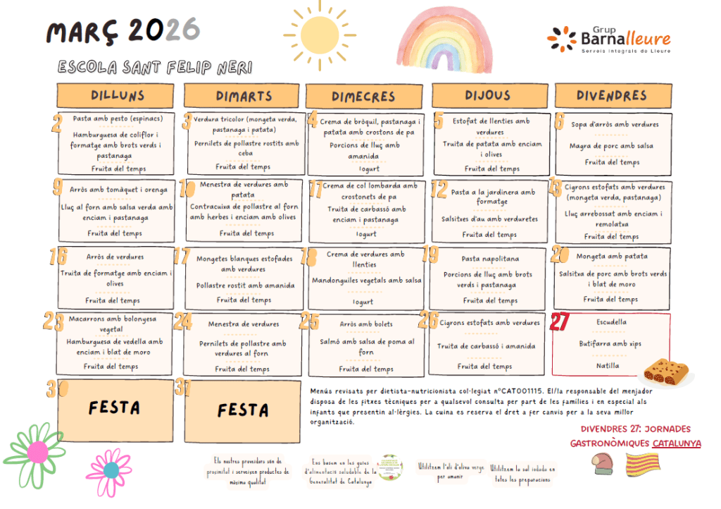 Menú menjador de Març 2026 2 de Març de 2026 Descarrega tots els menús Comparteix això: Comparteix al Facebook (S'obre en una nova finestra) Facebook Share on WhatsApp (S'obre en una nova finestra) WhatsApp Share on Telegram (S'obre en una nova finestra) Telegram Email a link to a friend (S'obre en una nova finestra) Correu electrònic Share on X (S'obre en una nova finestra) X M'agrada S'està carregant... Related