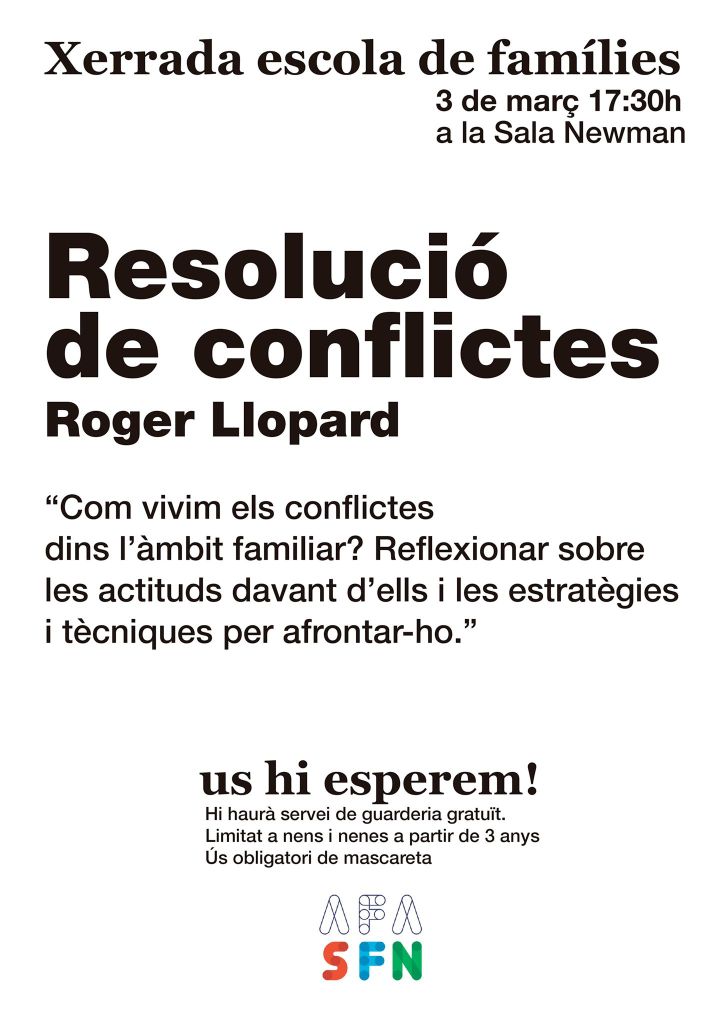 La xerrada serà “Resolució de conflictes. Com vivíem els conflictes dins de l’àmbit familiar? Reflexionar sobre les actituds davant d’ells i les estratègies i tècniques per afrontar-ho.”